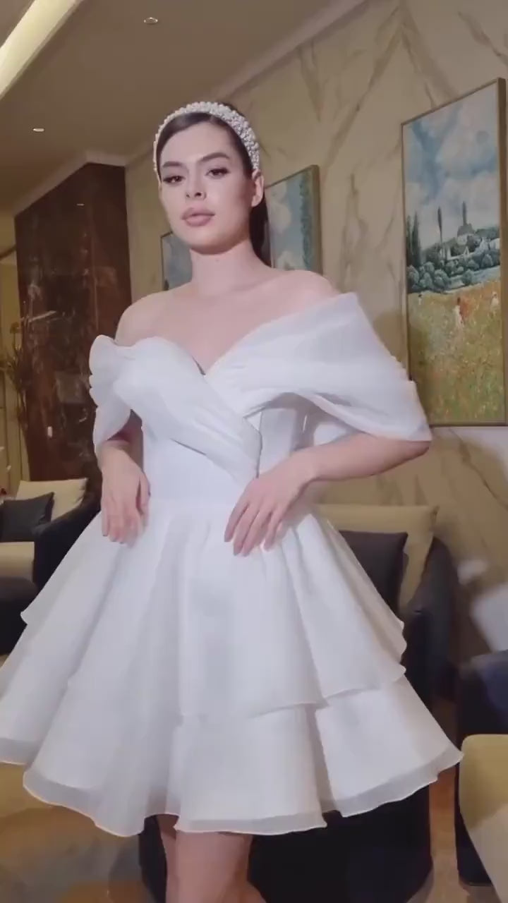 Meet JIRAFA — a breathtaking off-shoulder organza mini dress created for brides who want to shine with confidence, femininity, and playful elegance. This short puffy silhouette features dramatic layered ruffles, a sculpted corset bodice, and airy off-the-shoulder draping that enhances your neckline beautifully.
