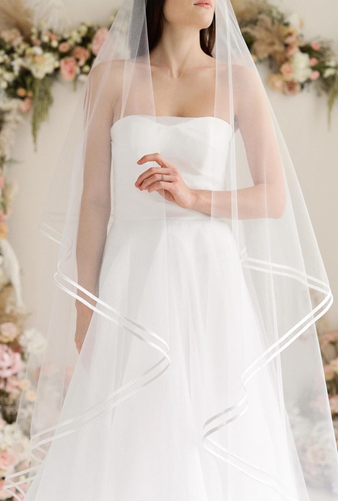- Soft Tulle Wedding Veil with Thin Satin Ribbon Edge, 1 cm satin edge