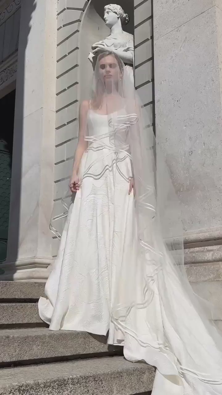 Designed for brides who value elegance in simplicity, the veil flows effortlessly, enhancing your gown with lightness and sophistication. The upper tier may be worn as a blusher for the traditional aisle moment, or allowed to cascade for a soft, layered silhouette.