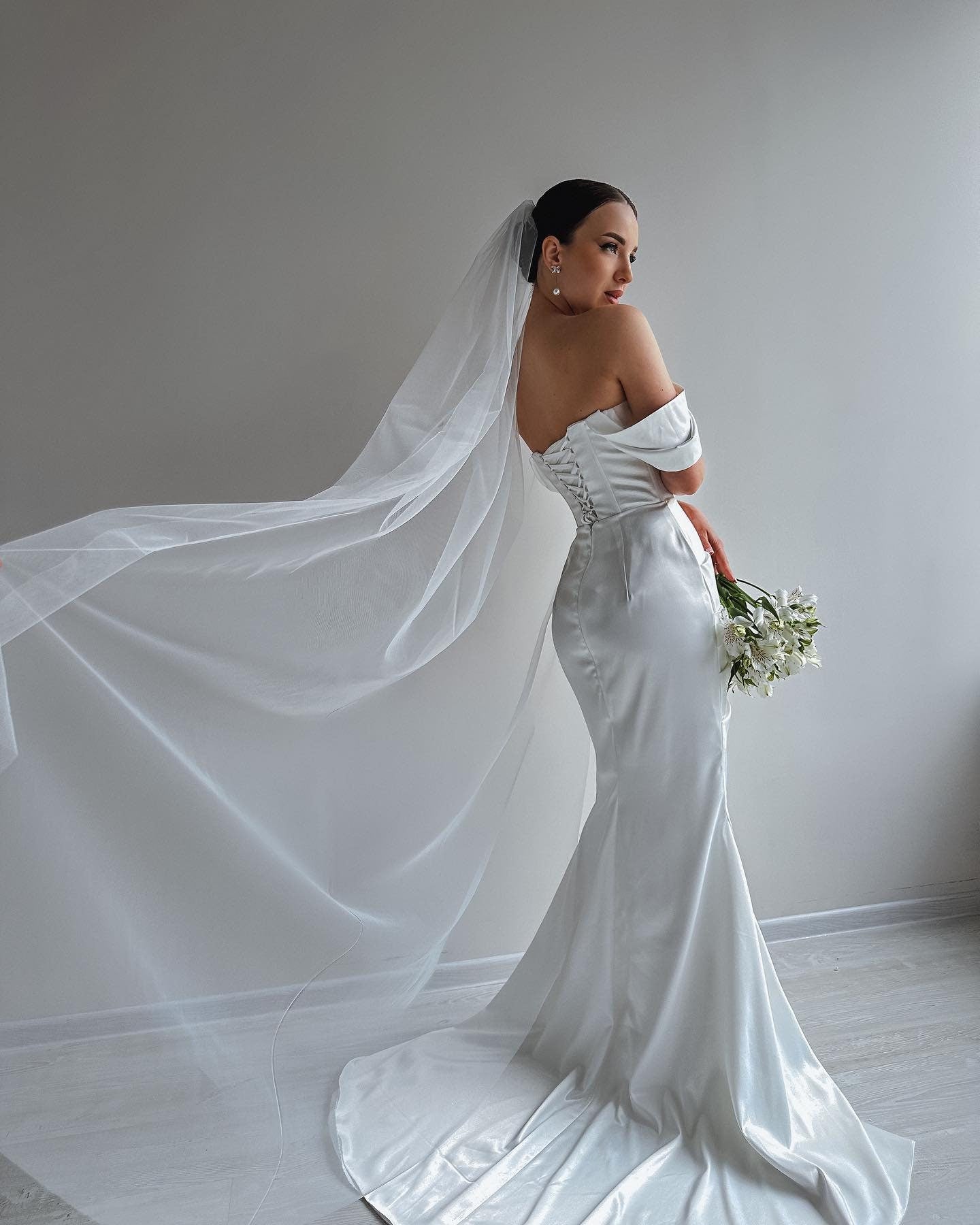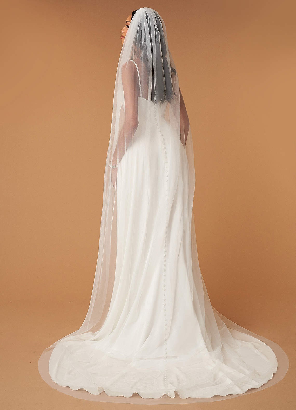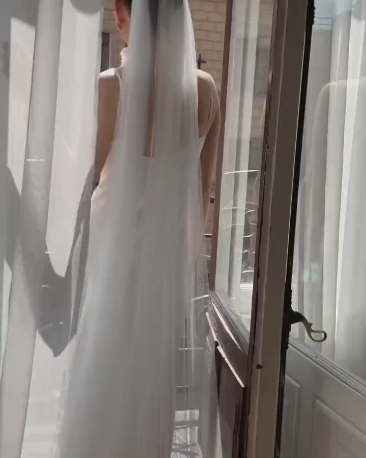 Whether you envision a dramatic walk down the aisle or a subtle bridal moment, this veil embodies refined simplicity and timeless grace — the perfect choice for modern brides who appreciate understated beauty.