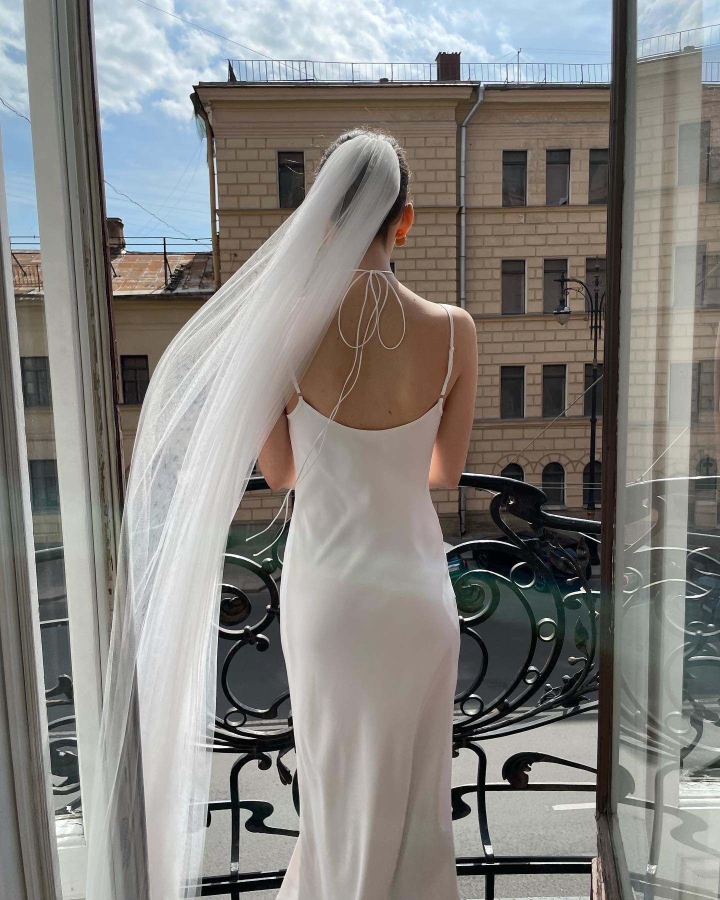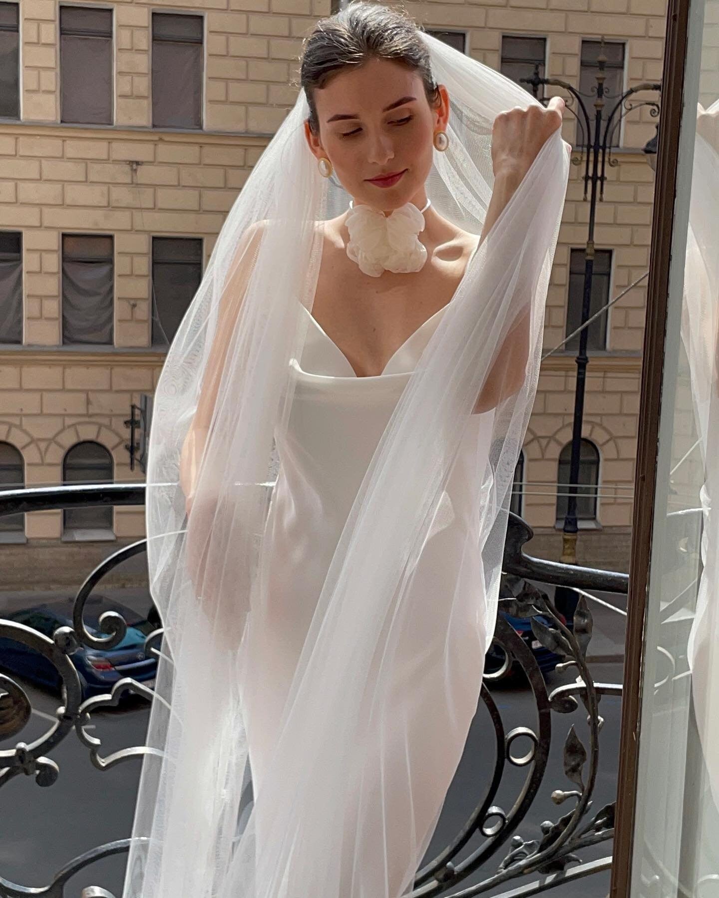 The airy, lightweight fabric drapes softly over your silhouette, creating a delicate and ethereal effect as you move. Whether you prefer a one-tier veil or a two-tier style with blusher, this design is available in multiple lengths: fingertip, chapel, or cathedral, making it suitable for any wedding setting — from grand ceremony to intimate vows.